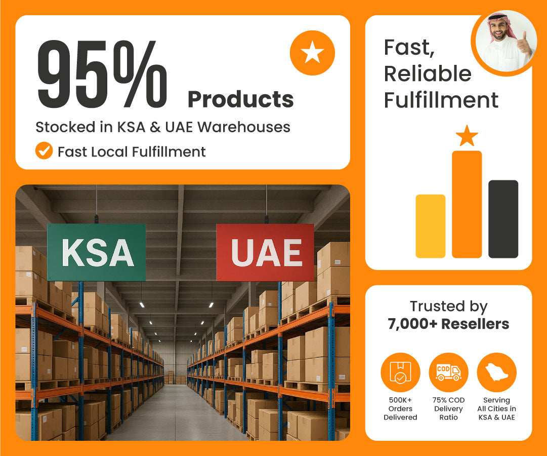 Welcome to the leading dropshipping platform in Saudi Arabia and the UAE, trusted by over 7,000+ resellers worldwide. We are dedicated to empowering entrepreneurs across the Gulf with our user-friendly platform, reliable sourcing solutions, and efficient logistics support.