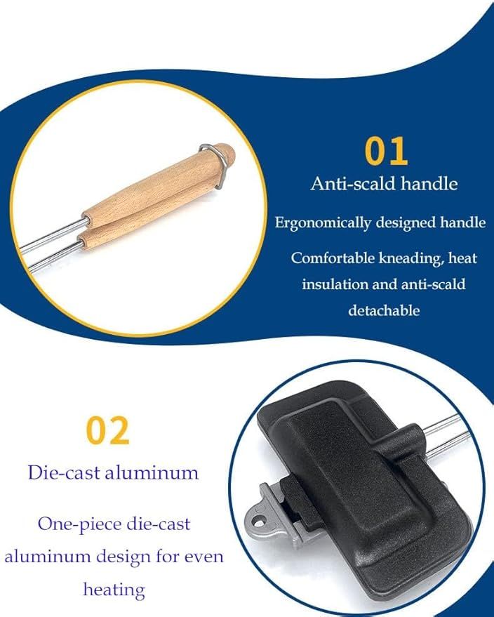 - Easy To Use Ergonomic Design -- Two handles can be locked for cooking, the design of the pie iron stops the ingredients from falling out, unique corrugated edge ensure a firm crimp which making it handy to cook things that generally fall to pieces on a traditional skewer. Just Simply apply oil to the plate of this sandwich maker, place the bread, fill with your favorite ingredients, lock the handes and bake on the stove, the two-tone color design prevents wrong flipping when grilling.